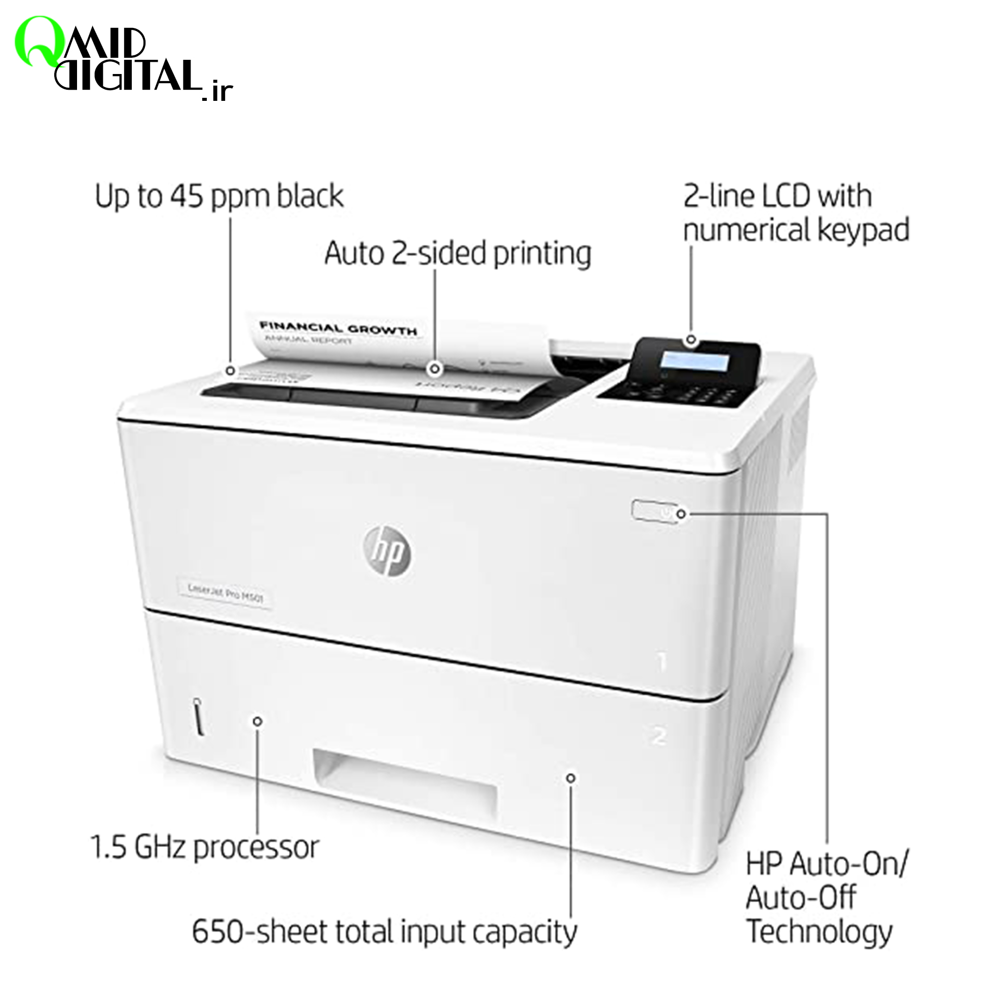 پرینتر  M501dnساخت شرکت hp یکی از محصولات کاربردی این شرکت است که به صورت تک‎کاره به بازار ارائه شده است؛ این محصول در واقع همان پرینتر  M501nاست، با این تفاوت که در این مدل قابلیت چاپ دورو نیز وجود دارد. این محصول با ظرفیت 100 برگی سینی ورودی خود برای استفاده‌های خانگی یا اداری مناسب است. البته برای خرید این دستگاه برای استفاده‌های خانگی بهتر است حجم کاری بالایی داشته باشید. این مدل از پرینترهای لیزری اچ پی اگرچه قادر چاپ به‌صورت رنگی نیستند اما همچنان لیزری بوده و برای چاپ متن و اسناد طراحی شده‌ است. بااین‌حال می‌توانید با استفاده از این پرینترهای لیزری به چاپ حداکثر 43  برگ در دقیقه بپردازید. همچنین مدل M607n دارای یک صفحه نمایش است و برای اتصال به کامپیوتر پور‌ت‌های USB 2.0  و Ethernet بر روی آن تعبیه شده‌اند. گفتنی است، یکی از قابلیت‌های برجسته‌ی این پرینتر، چاپ دورو است که برای چاپ مدارک نیازی به جابه‌جایی کاغد به صورت دستی نخواید داشت.